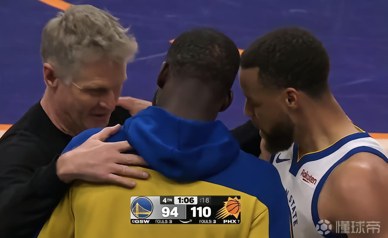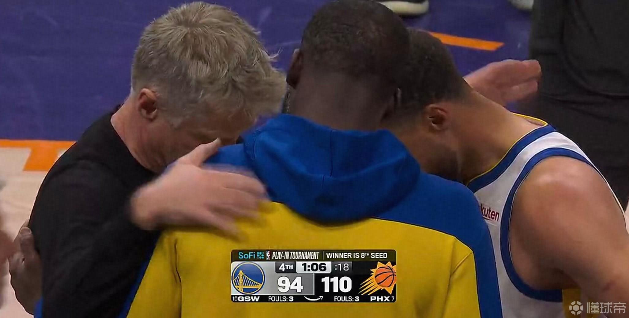 在比赛进行到第四节还剩1分06秒时,勇士仍落后16分,勇士主帅科尔选择投降,他将主力换下,并把库里与德雷蒙德-格林喊到身边进行交流,随后三人相拥致意。
