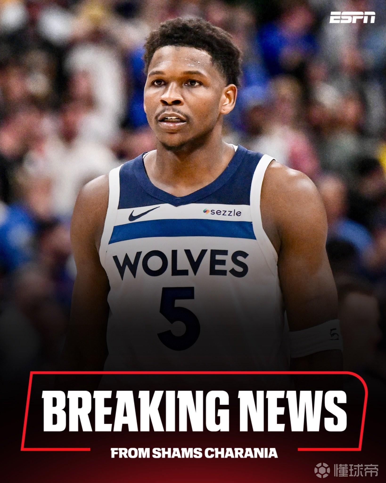 北京时间4月26日,据Shams报道,森林狼球员爱德华兹左膝受伤将缺席多个星期。