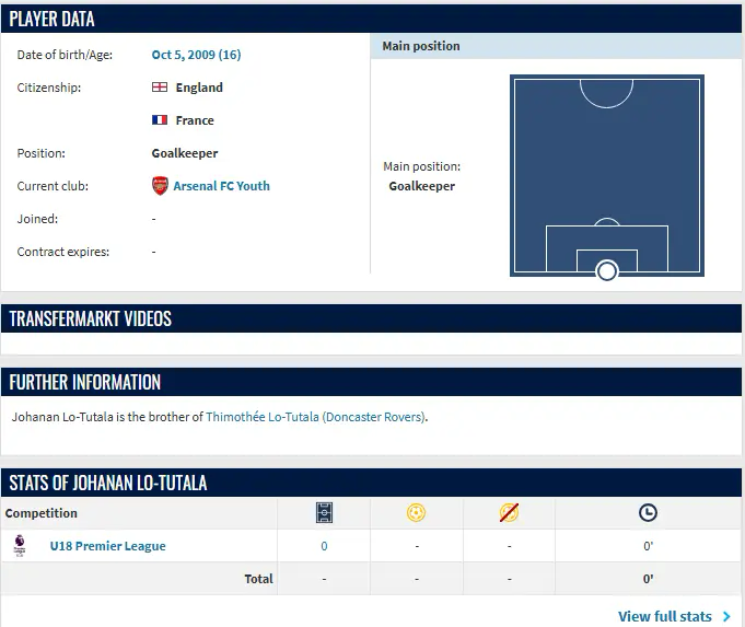 此前我们多次介绍过出生于2009年10月5日的洛-图塔拉(Johanan Lo-Tutala),身高2米的他很早便加入了阿森纳青训营,是一位有着法国和英格兰双国籍的门将。